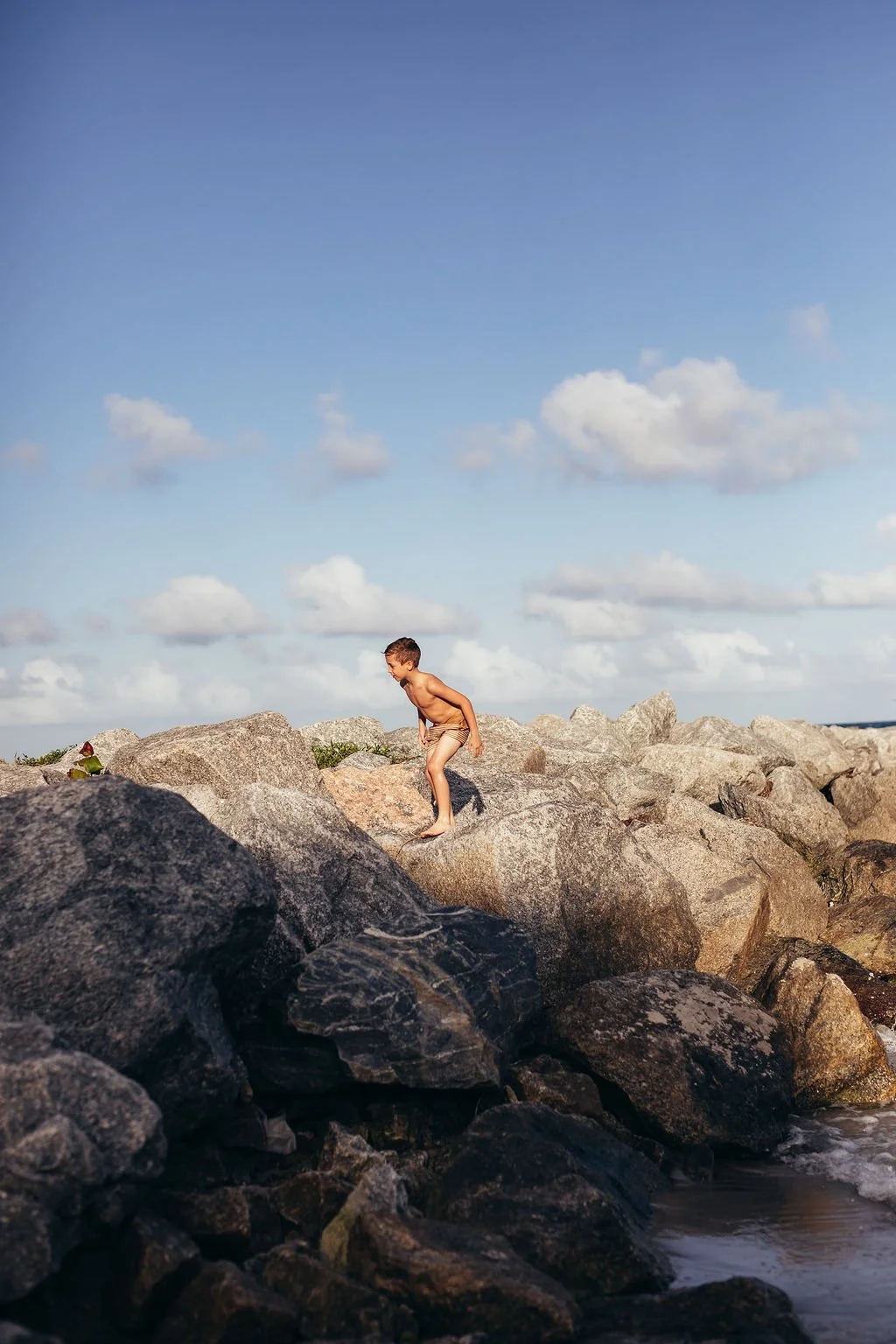 Adventurous kids lifestyle photo of a boy climbing rocks by the ocean—capturing curiosity, movement, and outdoor freedom. Ideal for commercial use in kids fashion, travel, or nature-based brand campaigns.