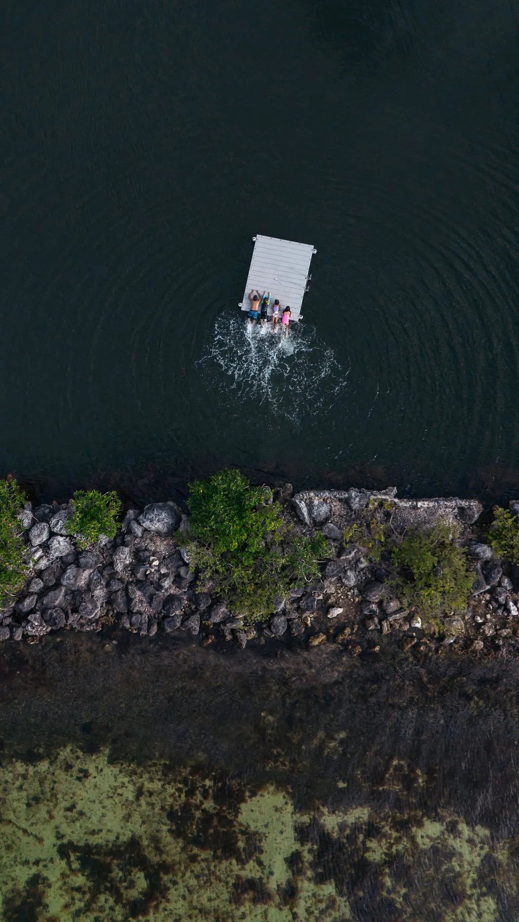 Breathtaking aerial lifestyle photo of children playing on a platform in the ocean, captured in the crystal-clear waters of the Florida Keys. Perfect for tourism, adventure, or family-focused commercial campaigns celebrating outdoor play and coastal View fullsize