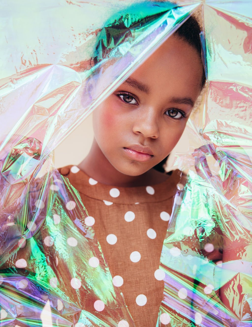 Young girl modeling fashion-forward clothing in a minimalist Zara-inspired editorial photoshoot with soft natural lighting. View fullsize